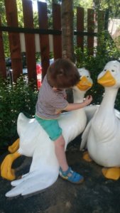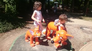 Volt anyuka-gyerek hinta, amiben egy jót hintáztunk hárman. Nekem nagyon tetszettek a rókalyukra hajazó járatok és csúszdák, a gyereke is élvezettel mászkáltak benne. Az állatszobrok is mászhatók. Gyorsan megnéztem a neten, hogy hívják a többi szereplőt, így villogtam a gyerekeknek. A játszótér körüli rajzfilm-képek, meg a szobor állatok alapot adtak egy kis mesélésre.