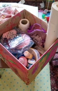 1. Van egy festős dobozunk. Ezt egy kartondobozból készítettük a gyerekekkel közösen, beborítottam csomagoló papírral az oldalát, a gyerekek pedig kifestették.