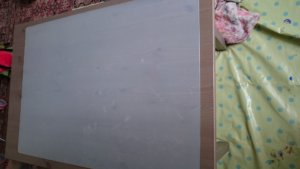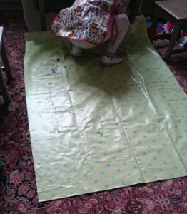 3. A kis asztalra vagy ráteszem a műanyag védőt, vagy arra is terítek egy viaszos vászon terítőt, vagy csak beborítom a lappal, amire festenek.