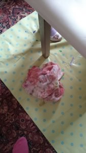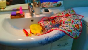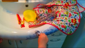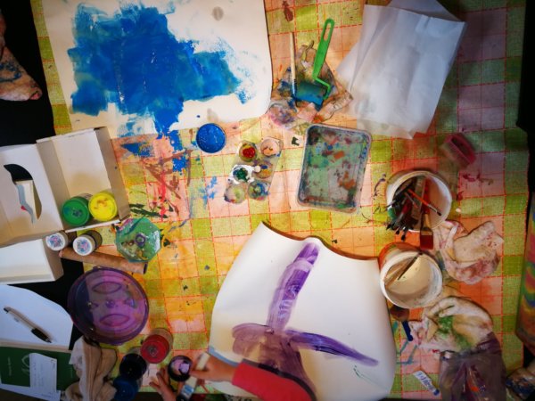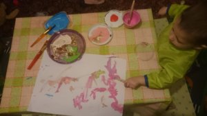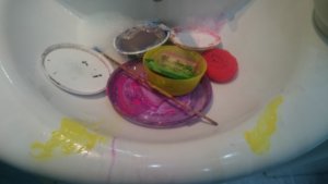 Az évek alatt igyekeztem kialakítani egy olyan rendszert, amiben hamar előkészülünk, ha festeni támad kedvünk. Az alkotás alatt minden a kezünk ügyébe esik: törlő, tálka, főleg törlő!! A végén viszonylag hamar el tudunk pakolni. Vagyis én elpakolok, bár a festékek elmosogatásában a lányom szeret segíteni.